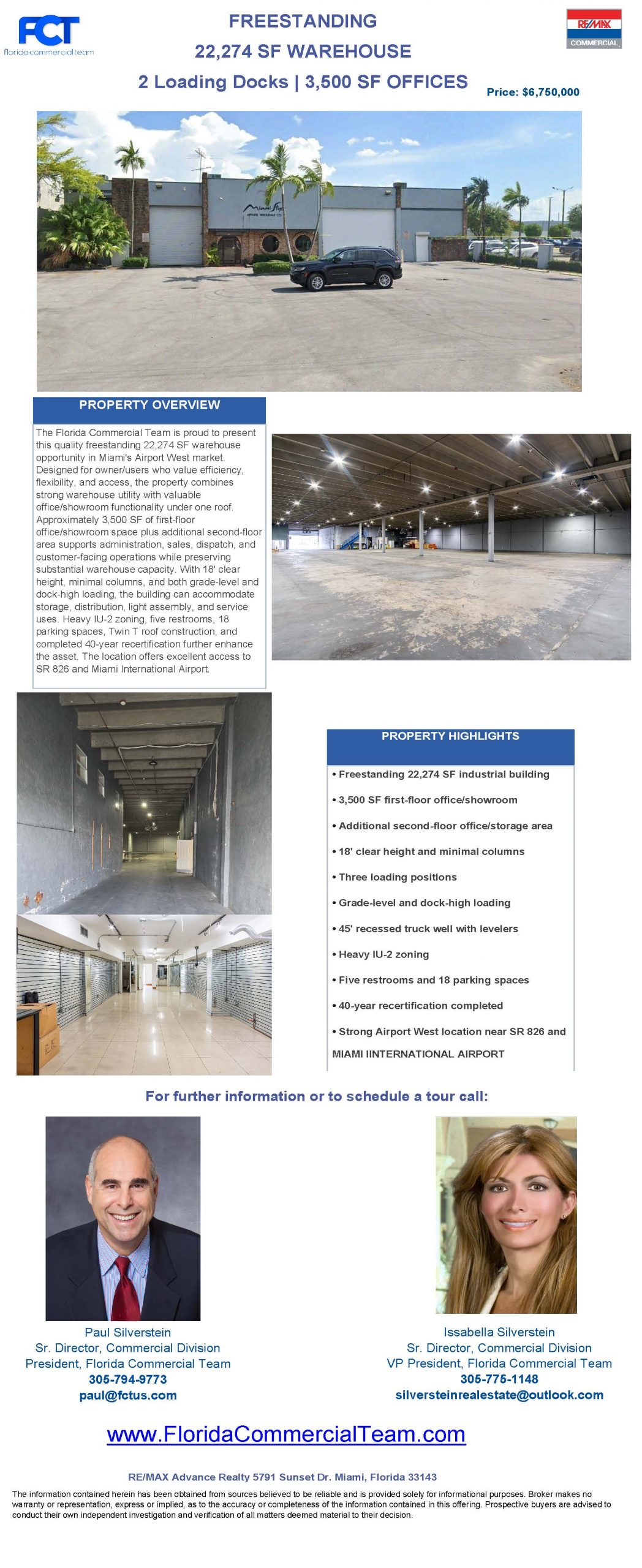 FREE STANDING 22,274 SF WAREHOUSE WITH 2 LOADING DOCKS | 3,500 SF OFFICES | 8 MINUTES FROM AIRPORT Description Details Listing Inquiry First name: * Last name: * Email: * Phone: Message: